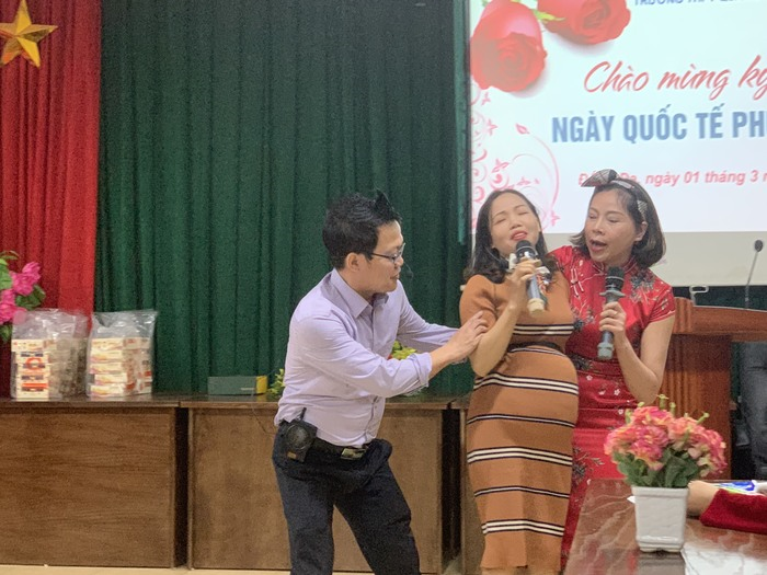 Tiết mục đồng ca "Mừng ngày 8.3" do cô giáo Anh Thư viết lại lời mới trên nền nhạc bài hát "Bông hoa mừng cô" được vang lên trong khi ban giám khảo đang chấm giải.